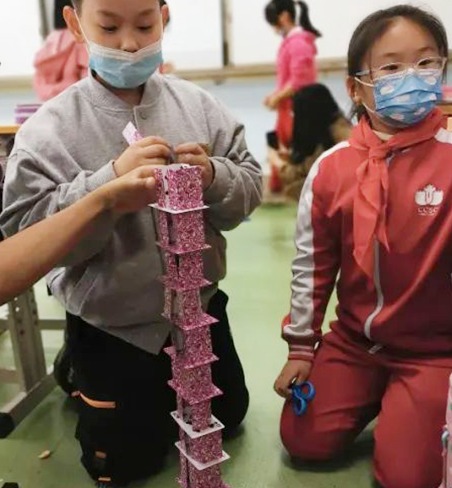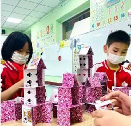 纸牌搭塔并不是简单的图热闹,而是蕴藏着深意。学生在搭建过程中会用到数学的几何知识和物体稳定性知识,不仅如此,还从中汲取到了健康成长的“养分”,比如总结成功的经验,吸取失败的教训,从而更加懂得合作的意义。
