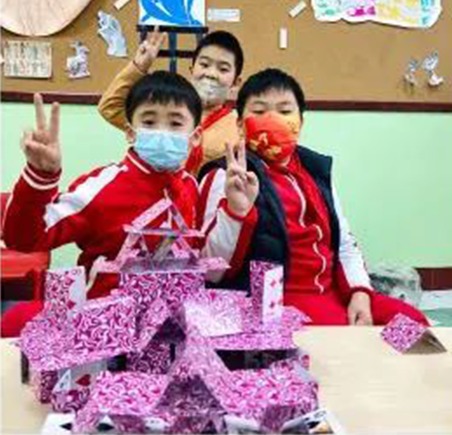 小小的扑克牌,给同学们带来了挫折,也带来了无穷的乐趣,不仅培养了大家的动手、动脑能力,还增进了队员们的互动,大家分工合作,相互配合,玩得不亦乐乎!就连居家学习的同学,也在家里独自搭建起了“扑克塔”,从而感受到这个活动所带来的快乐。