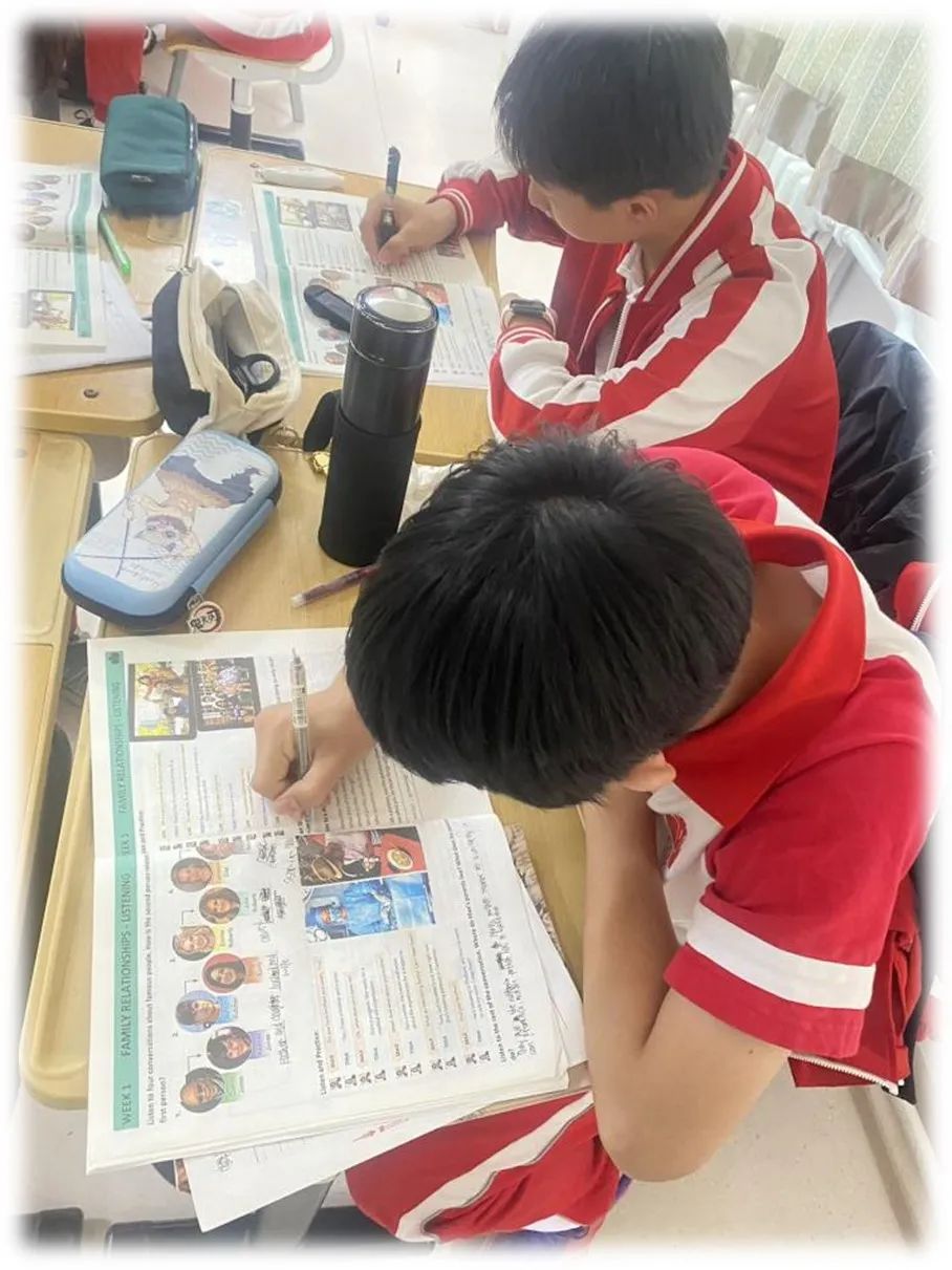 在语法学习中,学生练习使用简单现在时和现在进行时,他们用形容词和名词来描述他们的家庭,复习并练习使用量词;