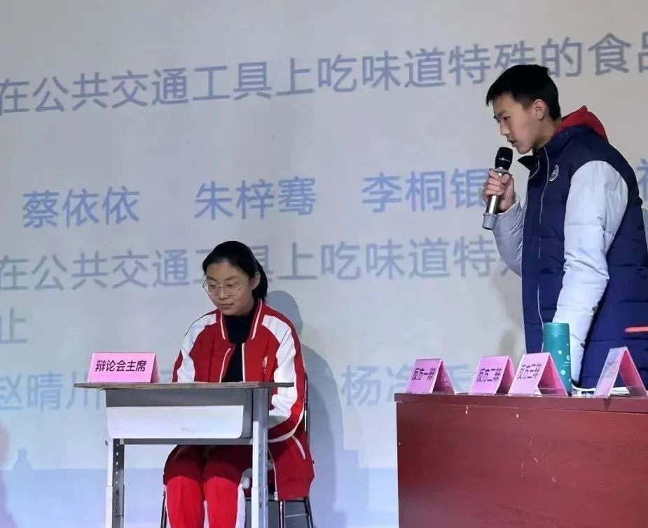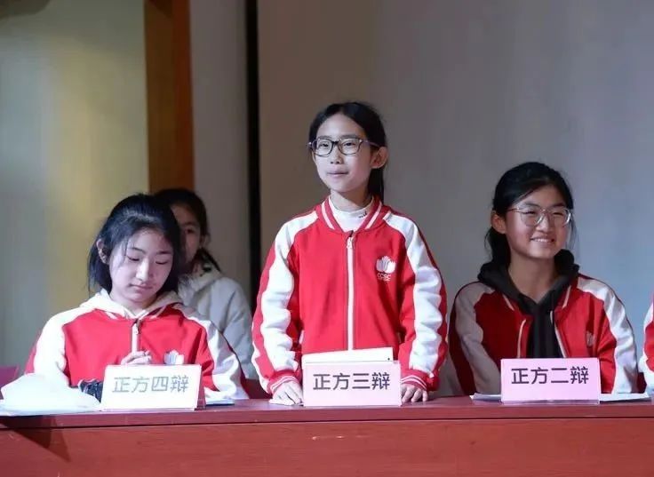 在七年级班级对抗赛中,双方辩手选择的题目是“家长对于孩子追星的担忧是必要的还是多余的”,正方三辩王语然勇猛迅捷,语速迫人,正方四辩平子晴沉稳大方、条理清晰,给现场观众留下深刻印象