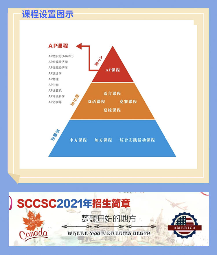 多元融合,高低相成,是中加学校的课程特色。中国普通高中课程、加拿大部分优质课程、综合实践课程是学校课程的根基。在此基础上开设的语言课程(雅思/托福/SAT)、国际竞赛、国际夏校、大学先修AP等课程,是学校课程的提升与发展。这种多元融合的课程体系,较好地满足了学生发展的需求;这种重学术宽基础的教学,较好地实现了高中与国外大学的衔接,为学生后续学习乃至终身发展都打下了坚实的基础。
