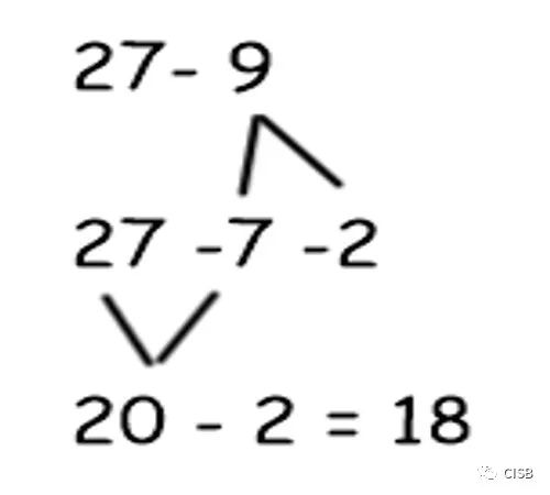 拆分法:这种方法需要理解所有的数字都可以拆分,以便更轻松地处理这些数字。学生在9中看到隐藏的7,并将其分成两部分(7和2)进行减法,以使数字更容易加减。
