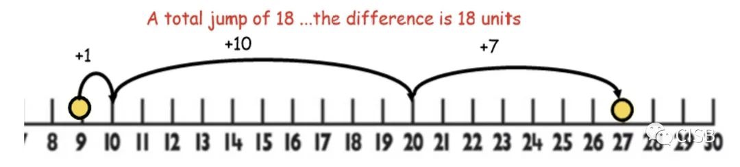 跳跃法:这种方法需要理解数字可以显示在一条数字线上,如果减法是差或距离,我们可以用一种有意义的方式移动这个距离。学生先跳到整数(10),然后覆盖最后7个空格,之后相加这些跨度,就可以看到结果是18。