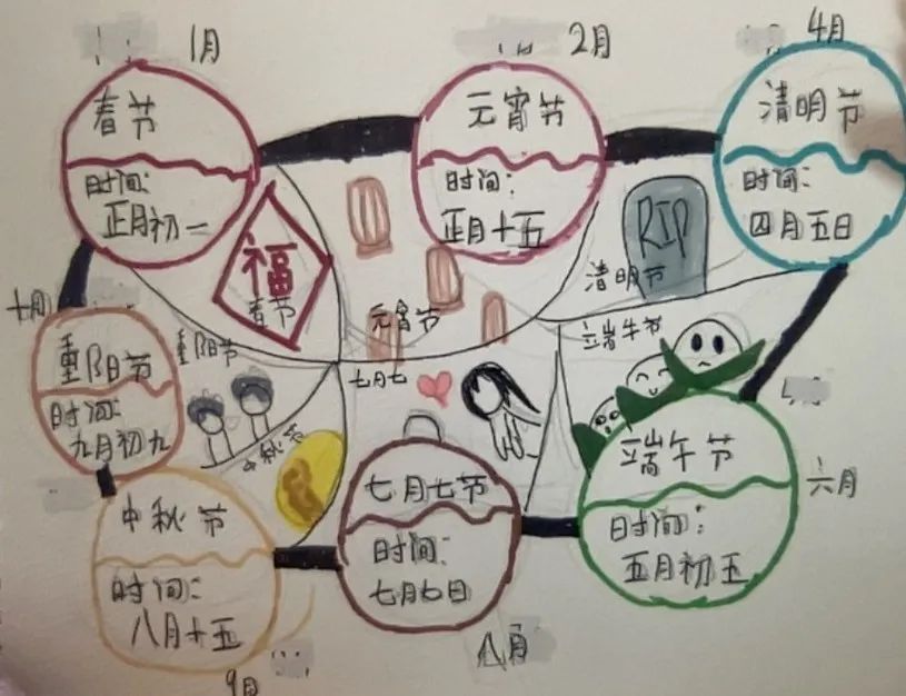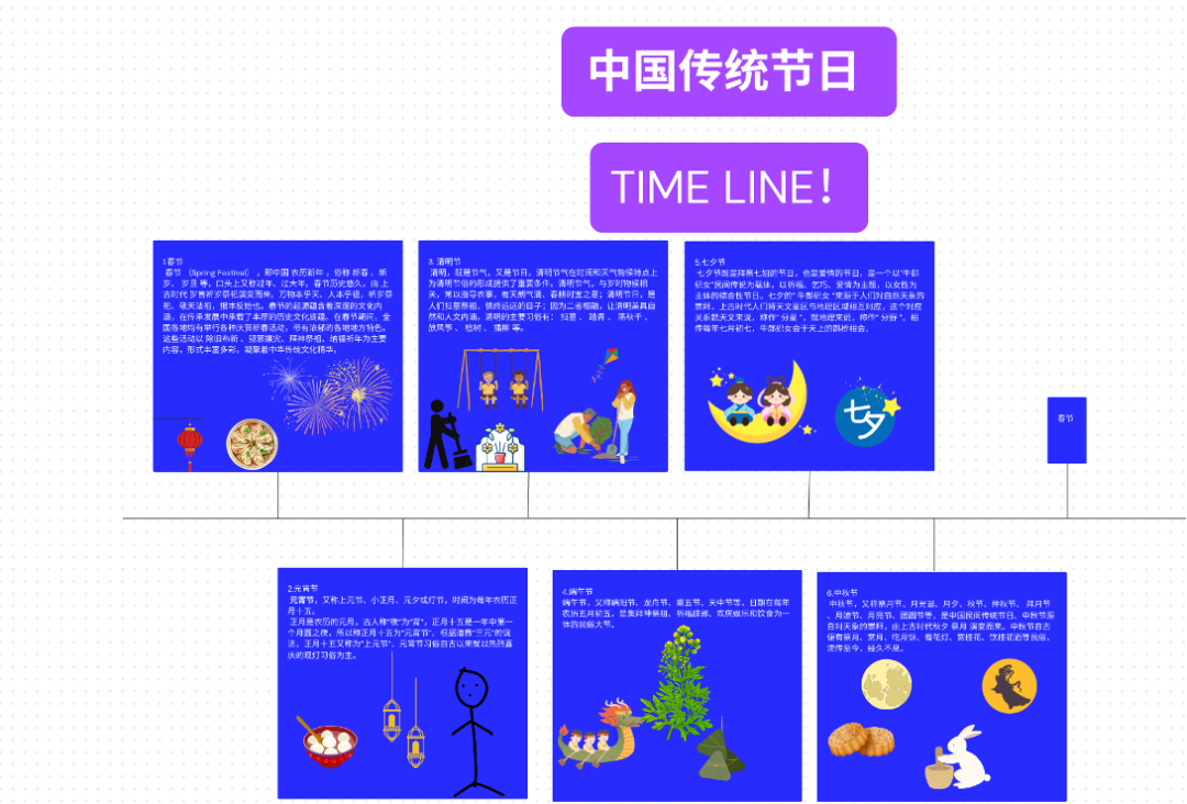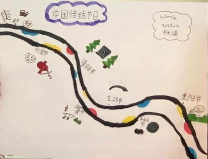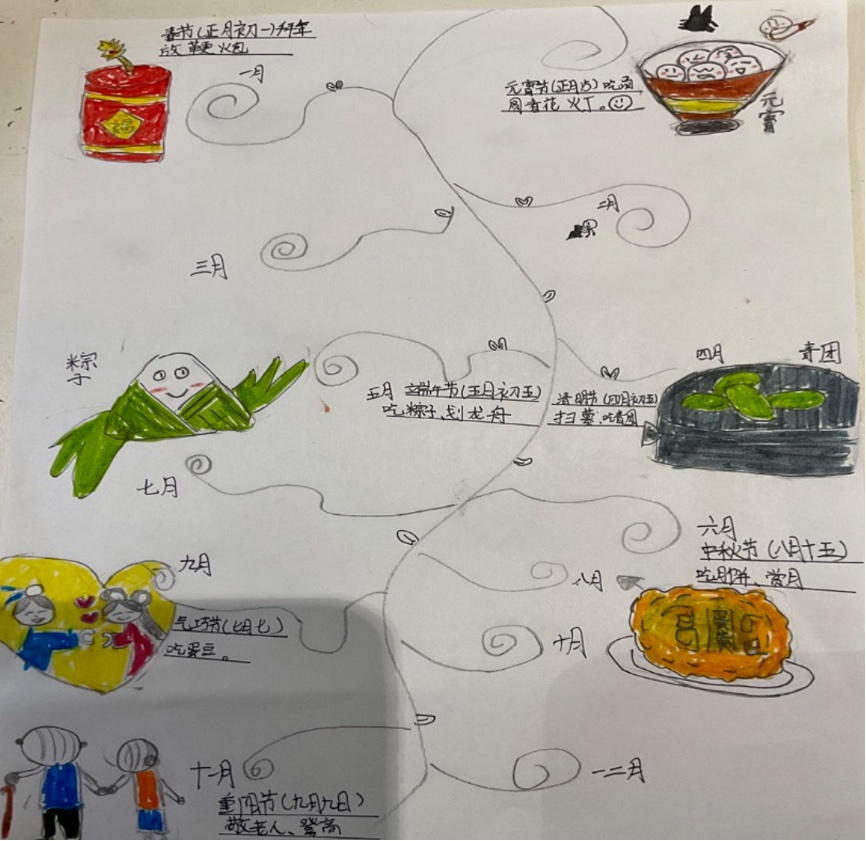 在课堂上让4年级的学生以时间轴的形式展示中国的传统节日,尝试使用各种视觉符号,逐一描述传统节日的习俗和特点。学生将每个传统节日的时间用农历的日期标注出来,显示出他们对中国文化的理解和浓厚的兴趣。