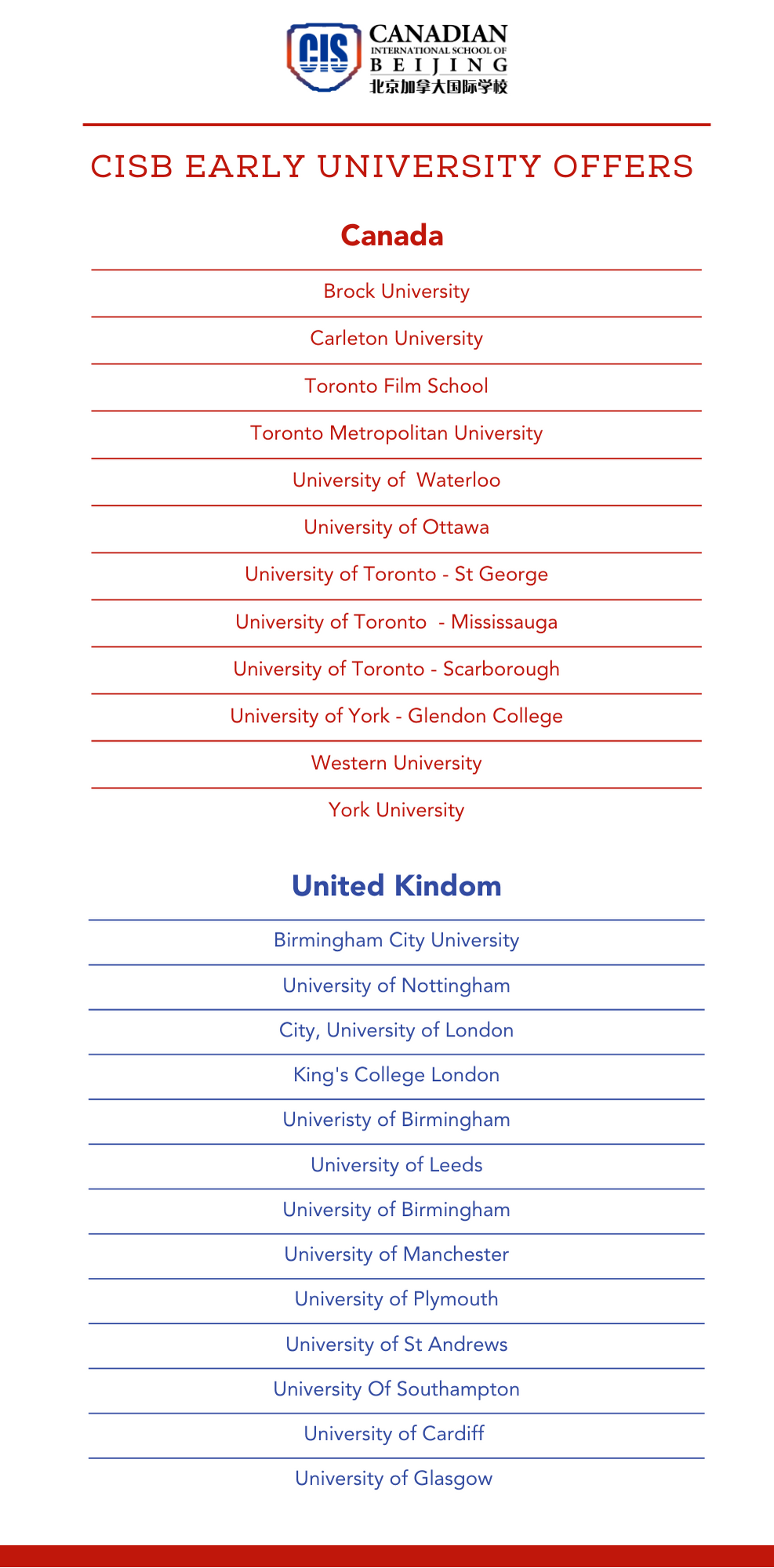 CISB的学生还收到了来自英国一系列著名大学的录取通知。这些大学包括伦敦城市大学、伦敦国王学院、圣安德鲁斯大学、伯明翰大学、利兹大学、伯明翰城市大学、卡迪夫大学、格拉斯哥大学、曼彻斯特大学、诺丁汉大学、普利茅斯大学和南安普敦大学。这些大学以其高质量的学术课程、世界知名的研究和卓越的师资而闻名。