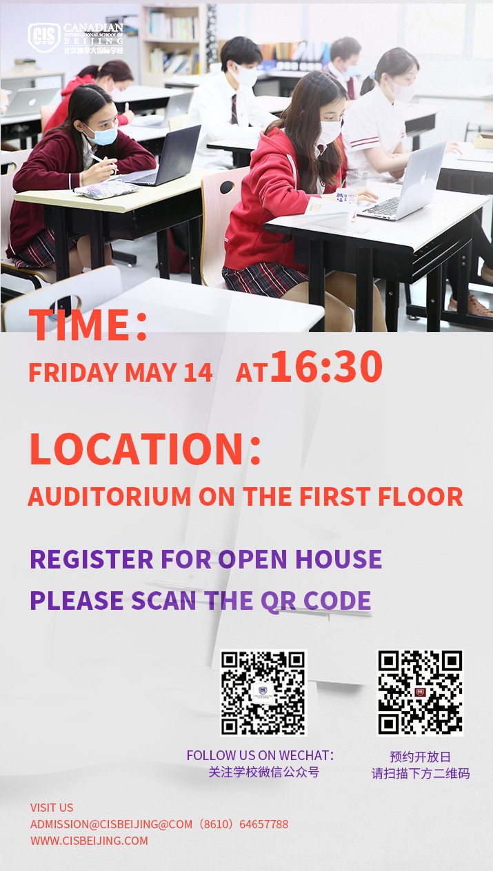 而眼下,就有一次很好的机会,可以走进国际学校,与老师面对面交流的机会。本周五5月14日,CISB北京加拿大国际学校的Open House将在下午16:30-18:00在校内举。