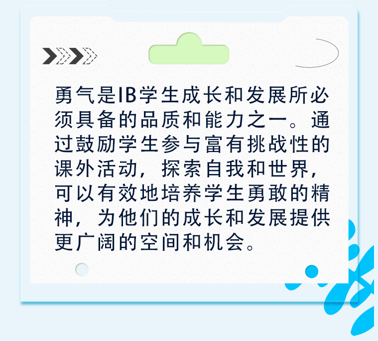 课外活动是IB课程中一个关键的组成部分,通过参加课外活动,学生可以获得与课堂学习不同的体验和机会,也可以更好地发展自己的勇气。