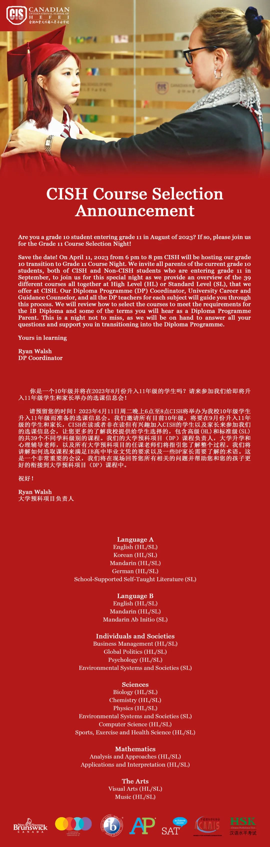 On April 11, 2023 from 6pm to 8pm CISH will be hosting our G10 transition to G11 Course night. We invite all parents of the current G10 students, both of CISH and Non-CISH students who are entering G11 in September, to join us for this special night as we provide an overview of the 39 different courses all together at High Level(HL) or Standard Level(SL), that we offer at CISH.