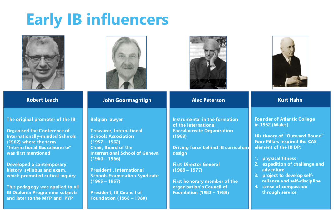 IB最早诞生于1960s,当时主张反战的思想家们认为战争爆发的很大一部分原因是因为人与人之间的不了解和不包容。他们希望有一种教育可以让人们消除误解,尽量包容对方。 这种思潮的影响下, 产生了IB的雏形理念。