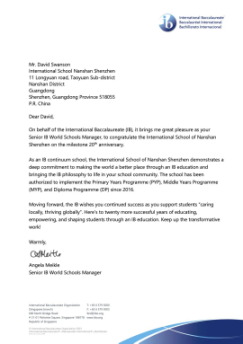 同时,来自海外的祝贺也让这个庆典更加隆重。ISNS 主席 Dr. Francis Pang 通过远程视频发来他的寄语。国际文凭组织(IB)也向ISNS发来了祝贺。