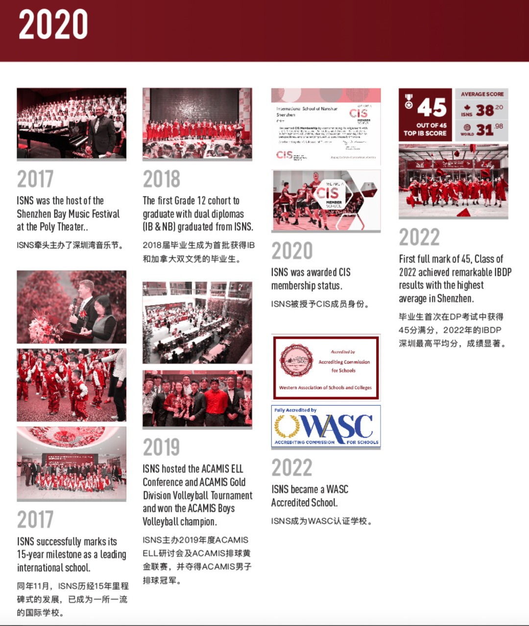 ISNS 20周年历程展在中庭展出,这场展览回顾了ISNS自2002年建校以来的二十年发展历程——ISNS学校如何一步步走来,发展成为世界一流的学校。ISNS的使命是培养优秀人才,帮助学生成为全球公民,在世界任何地方都能茁壮成长。现如今,ISNS的学生在全球范围内发挥着他们的影响力,让ISNS不仅享誉深圳,更蜚声国际。据介绍,ISNS还将在今年11月获得国际学校理事会(CIS)的全面认证,这标志着学校发展的另一个里程碑。
