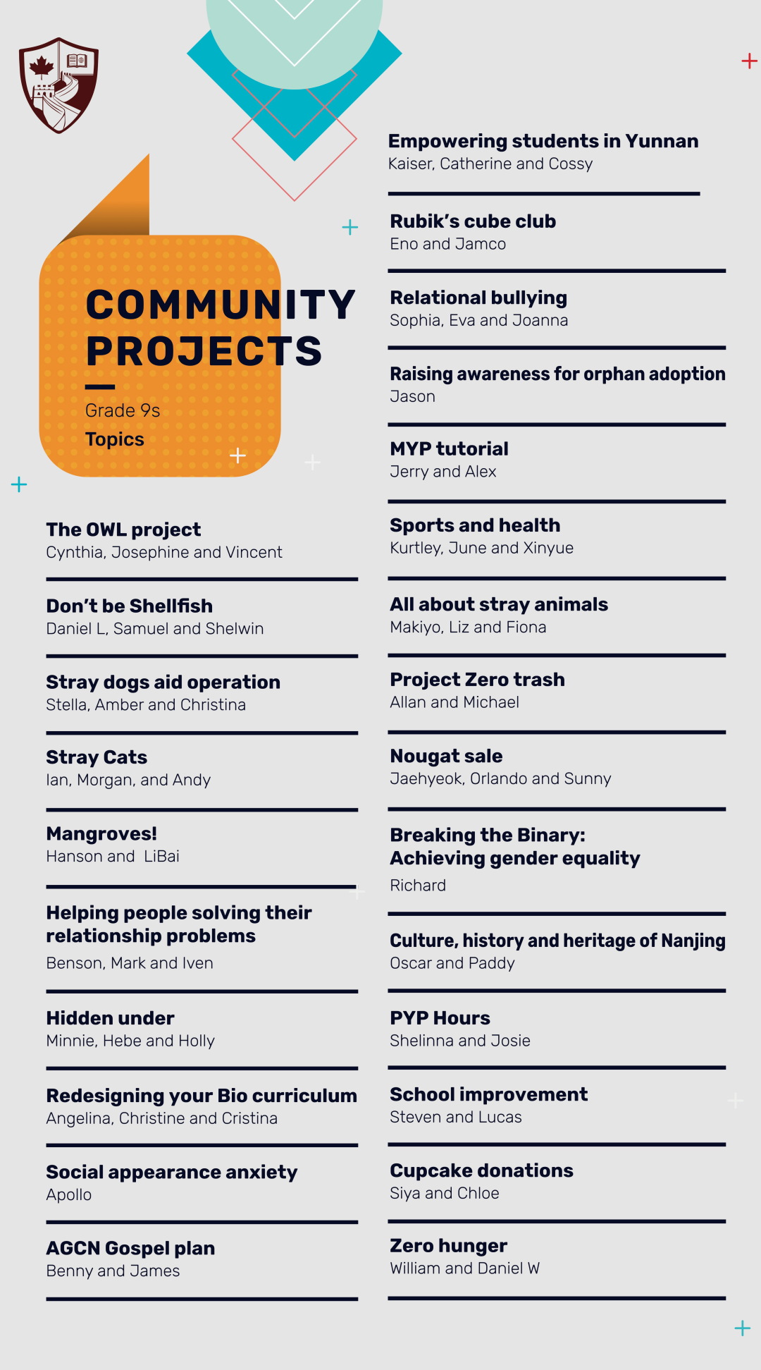 在6月2日,您将看到学生的项目范围涵盖了支持云南红十字会、向小学高年级传达平衡发展的信息、透过探访看望对安老院产生正面影响,以及为九年级学生设计另一种生物课程等等很多。我们不仅为他们对周围社区产生的影响感到自豪,也为他们参与他人的发展成长感到骄傲。