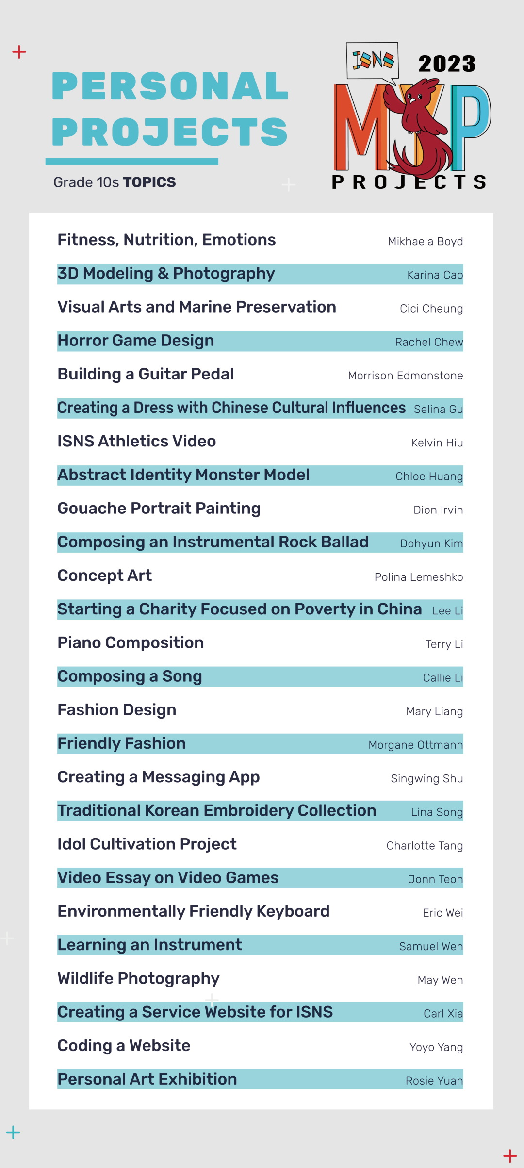 该展览一直是一个令人兴奋的活动,参观者可以见证我们十年级学生的创造力和创新力。展览涵盖了艺术、音乐、设计、技术等各个领域的项目。它还展示了我们学生多样化的兴趣和才能,ISNS社区期待着庆祝这一美妙的活动!