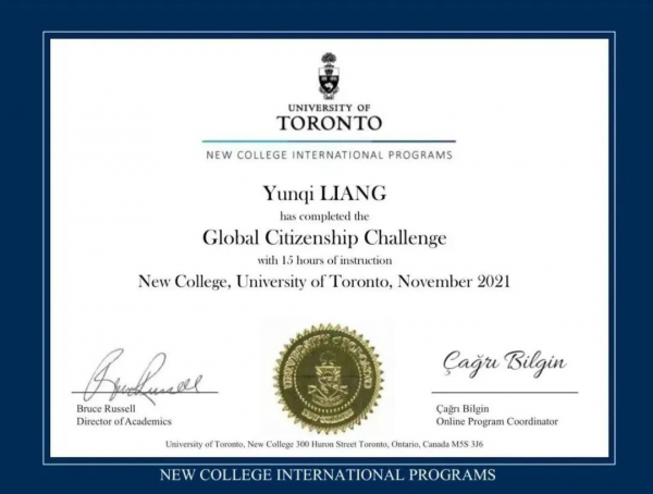 梁蕴琪同学同时被多伦多大学、麦克马斯特大学、阿尔伯塔大学、香港理工大学、墨尔本大学、悉尼大学、新南威尔士大学、昆士兰大学、蒙纳士大学多所大学同时录取。同时,她还获得了高达9000加币的奖学金。