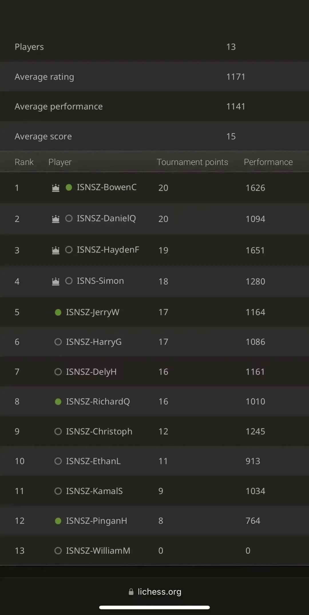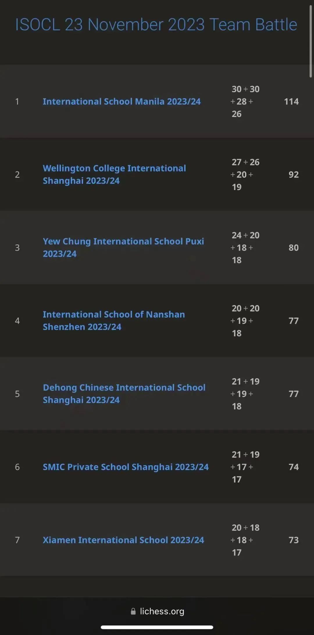 我们国际象棋俱乐部的核心是竞争性的在线国际象棋联赛,这是一个三轮的赛事,最后一轮由排名前6的棋队参加。在第一轮比赛中,ISNS 获得了相当不错的第七名,在第二轮比赛中获得第四名,展示了大大的进步。在卓越的个人表现的推动下,我们团队的集体努力体现在排行榜上。