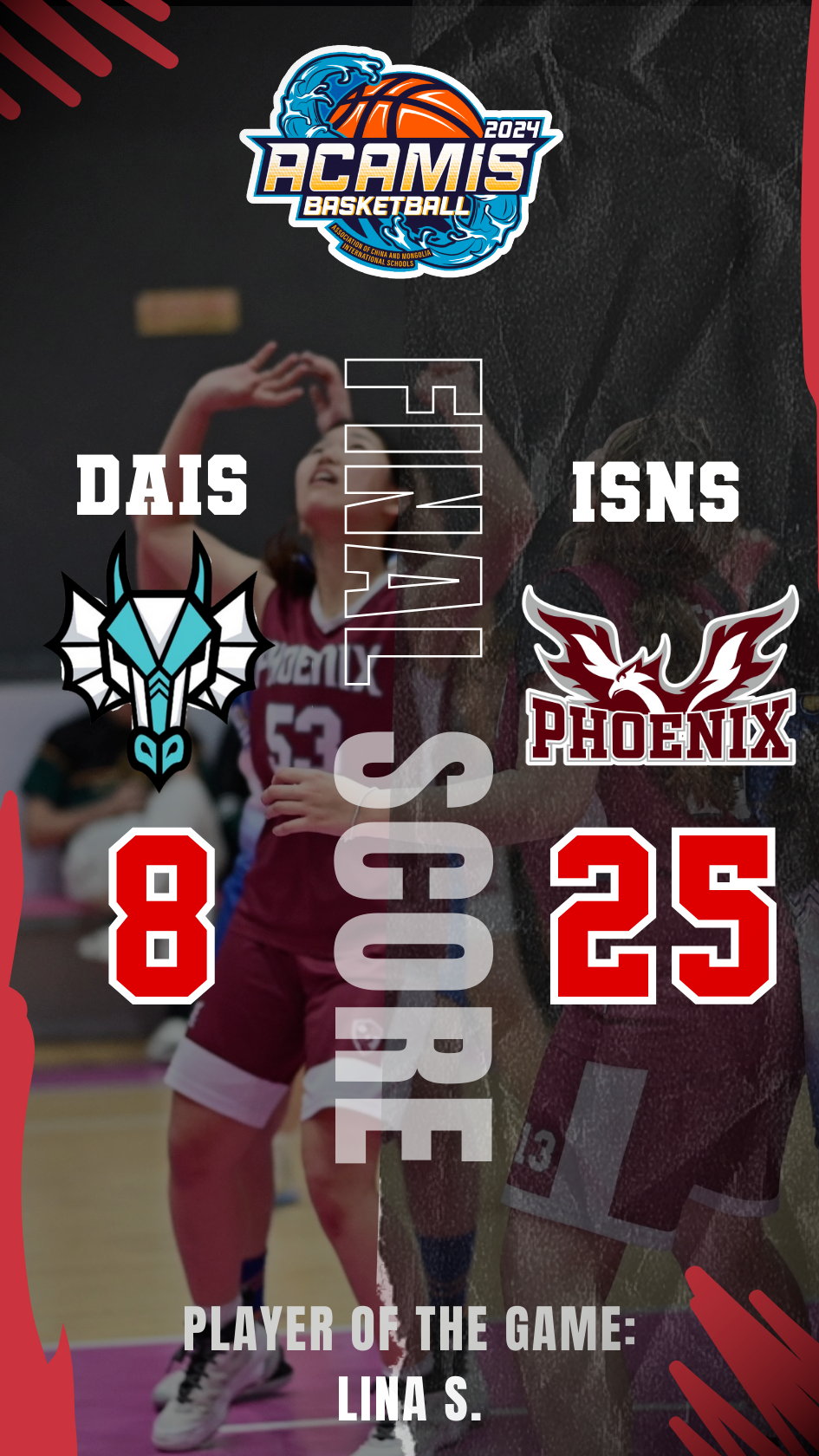 “非常荣幸能够在ACAMIS篮球锦标赛中获得ISNS有史以来第一个女子冠军。非常感谢那些一直为我们加油的球迷,感谢我们整个赛季所面临的竞争,感谢你们助我们成长。这只是一个开始,未来有更多荣耀等着我们去摘取,Go Phoenix!!!”