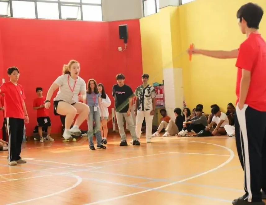 第二个游戏需要每组8位小伙伴以接力的形式完成两次跳大绳,若中途失败则需重来。虽然圆方小伙伴们从未接触过跳大绳的游戏,但是每一个学生都沉浸其中,不畏惧挑战,享受过程。