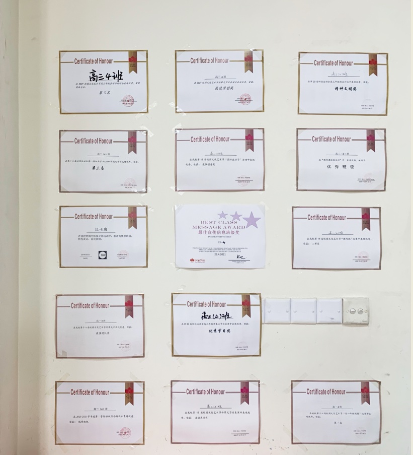 来到四班的教室,一整面墙的奖状见证着他们三年成长的点点滴滴。无论是学习、竞赛、体育运动还是各项文艺活动,都屡获殊荣。教室后面的爱国主义主题海报,也时刻提醒着即将远赴大洋彼岸的同学们,要始终怀着一颗赤子之心,即使身在千里之外,也要永远心系祖国。