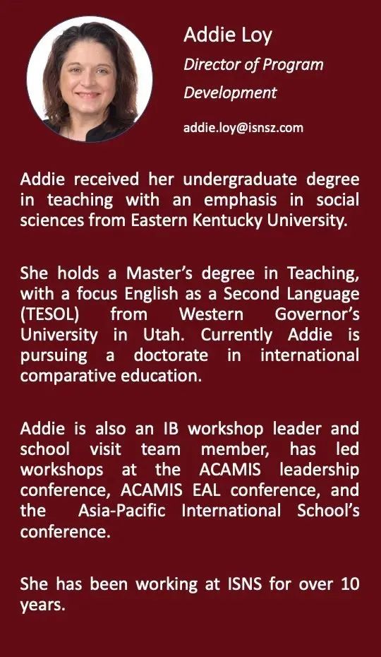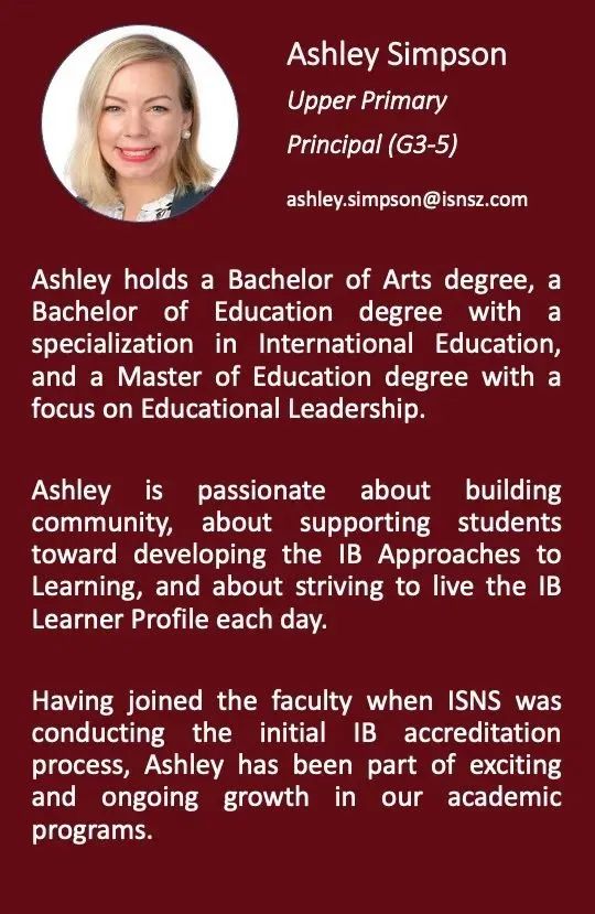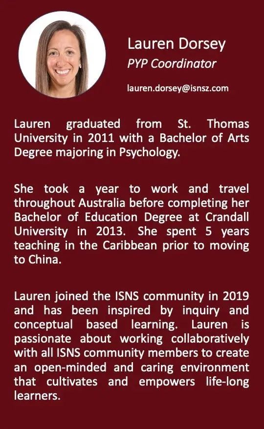 ISNS的学术课程逐年精进,保持在本市IB学校的顶尖水平。随着孩子们开始新学年的学习之旅,您会感受到他们得到了最好的教育。我校长期追求的目标是帮助您的孩子成长为一名有爱心、负责任的全球公民,为在世界任何地方拥有一个成功的未来做好准备。