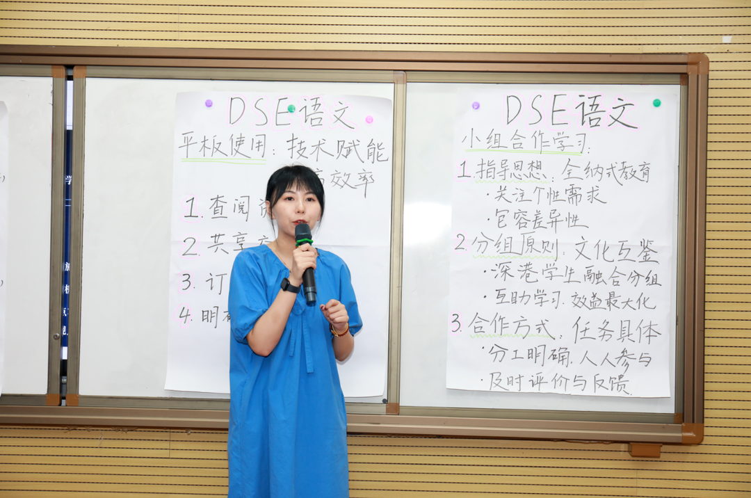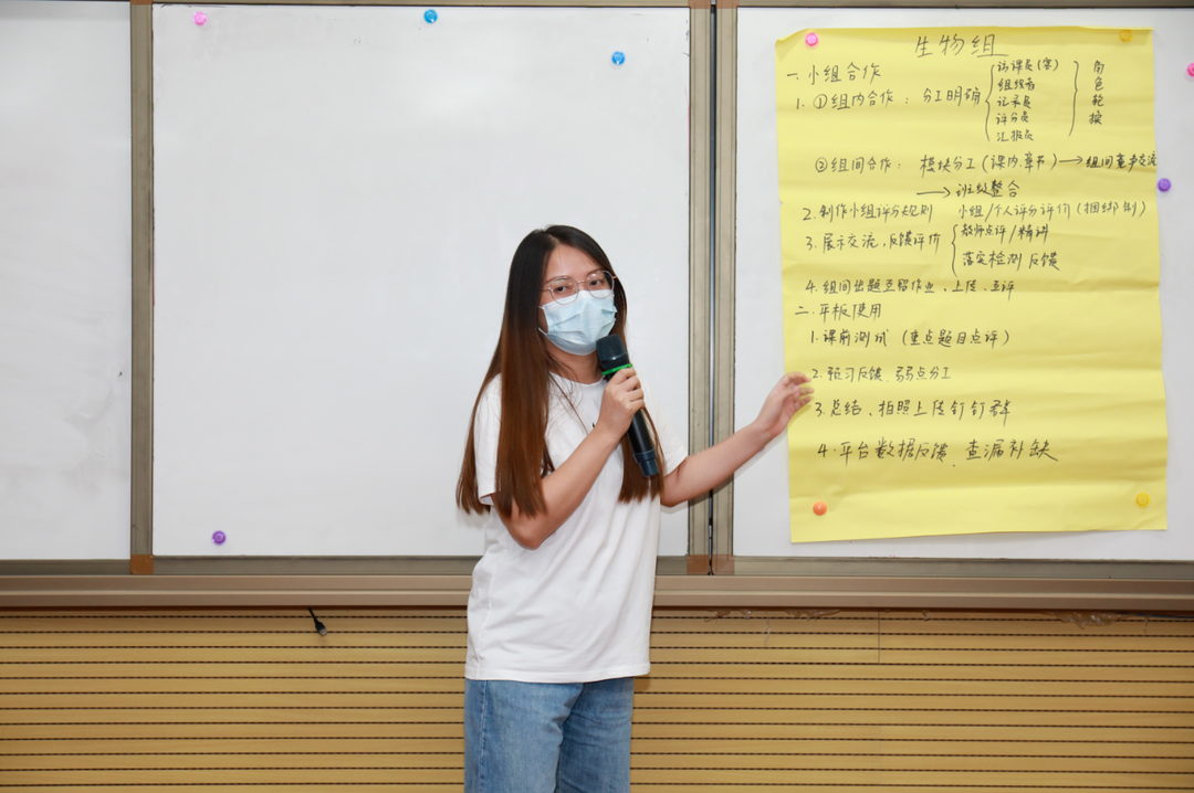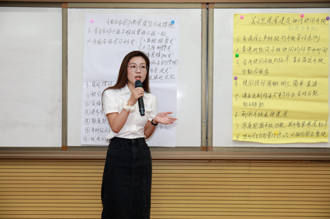 随后,全体教师按照年级、学科、班型划分小组,对“小组合作学习课堂落实办法”及“平板使用如何支持学习型课堂建设”两方面进行了交流。全体教师群策群力,分享小组合作学习经验及平板在智慧课堂中的应用。老师们的发言既有共性,也有学科特色,为小组合作学习提供了新思路、新办法。